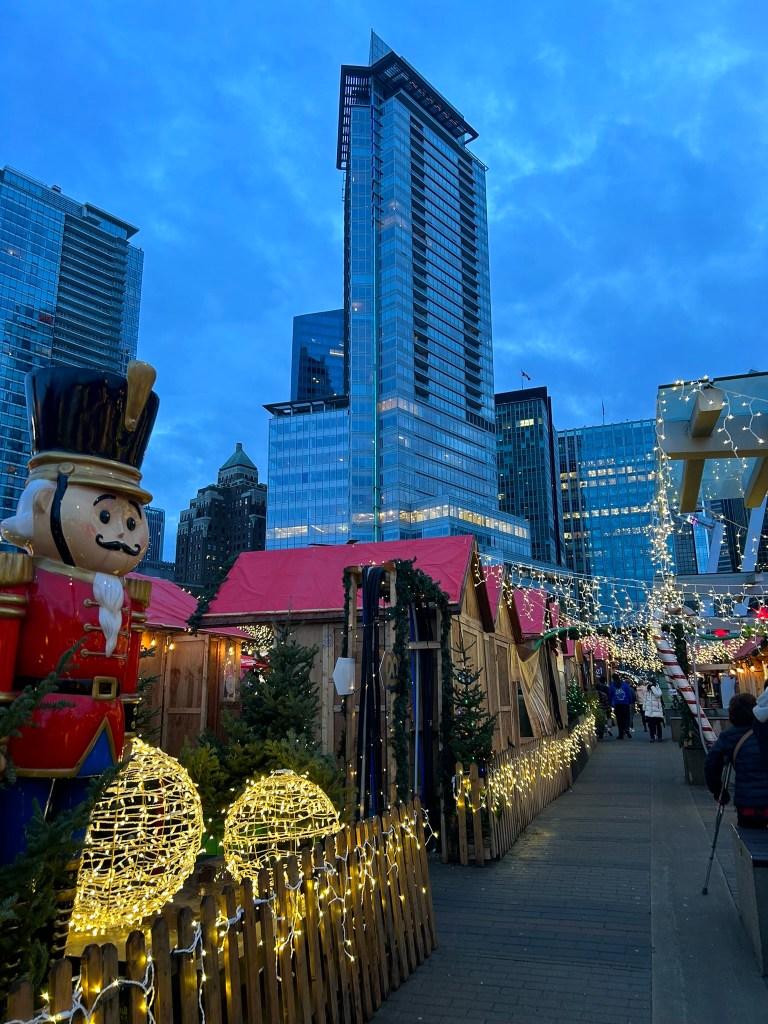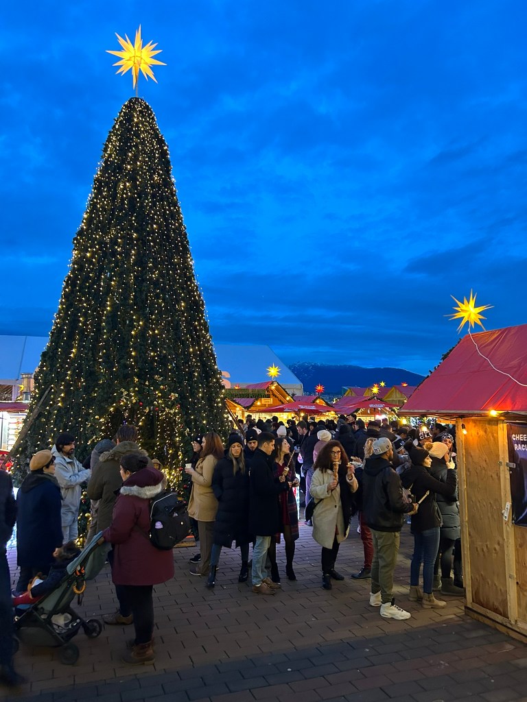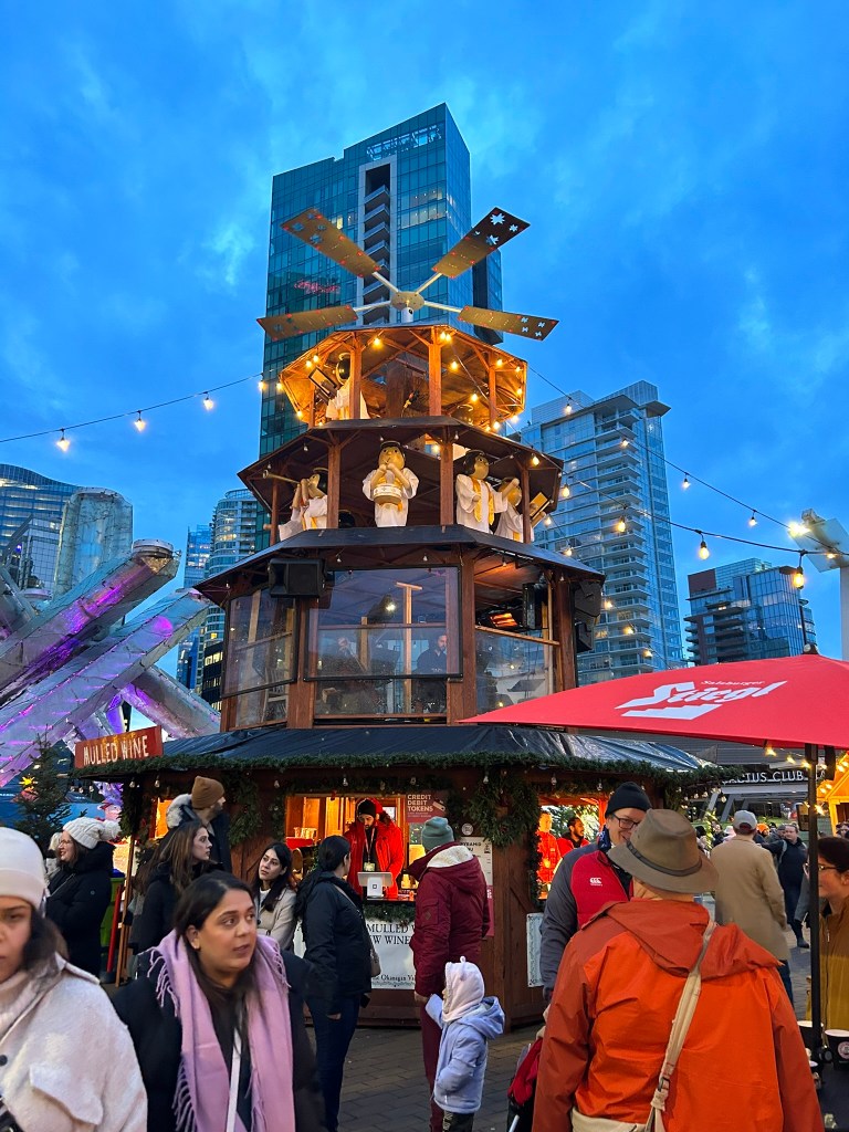 I visited the Vancouver Christmas Markets in December 2023, which are German themed and have unique features I have not seen elsewhere. Located in Canada Place, the markets stretch across the harbour wall and have amazing views across Coal Harbour. What makes the markets unique is that there is a multi-story timber hut; the bottom level contains a bar, in the middle is a live music stage, and there’s a nativity scene on the top level. Beautiful carols were played by a string quarter which could be heard no matter where you were in the market. This added to the cosy festive vibes.